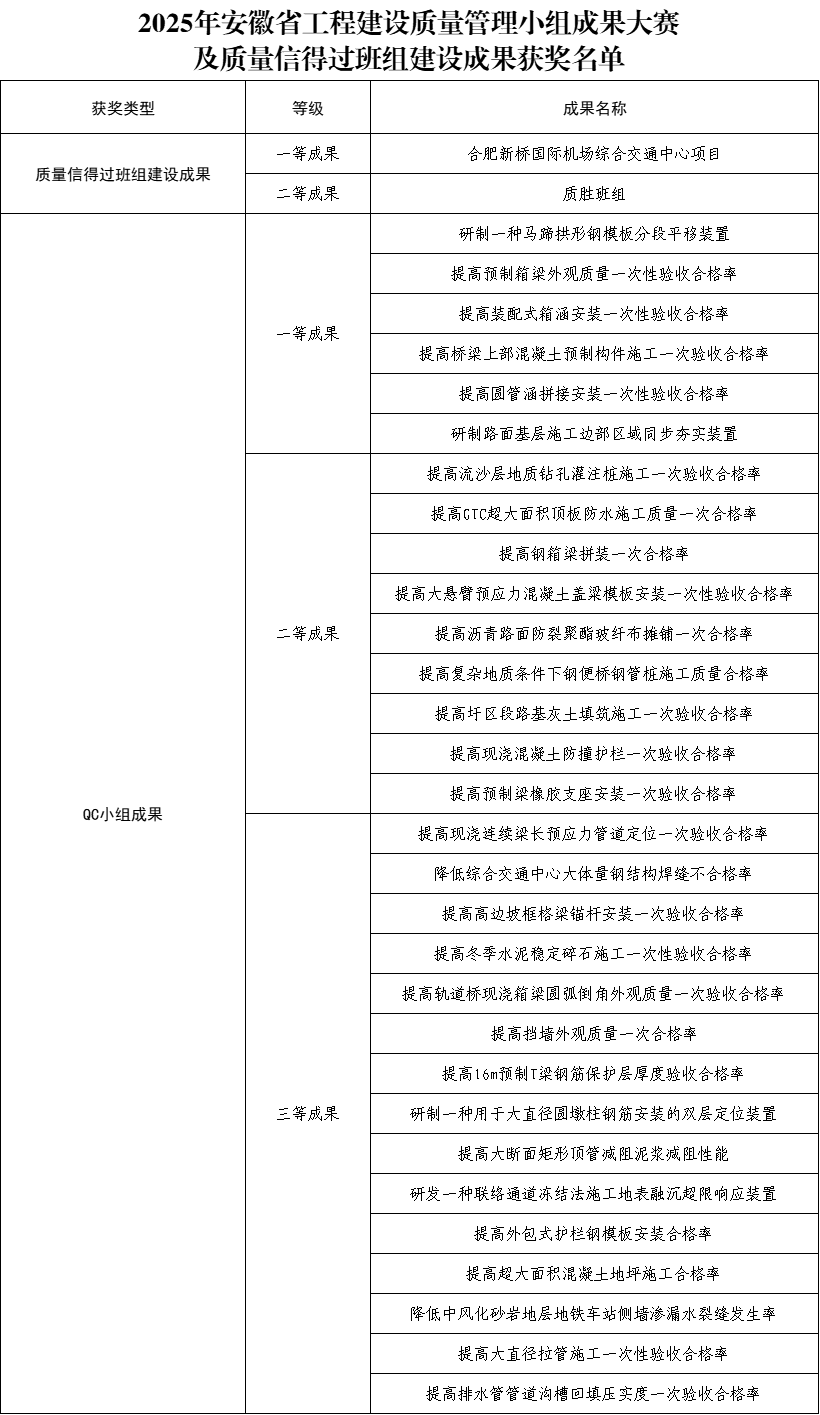 近日,安徽省建設(shè)工程質(zhì)量與安全協(xié)會(huì)公布了2025年安徽省工程建設(shè)質(zhì)量管理小組成果大賽及質(zhì)量信得過(guò)班組建設(shè)成果獲獎(jiǎng)名單,公司申報(bào)的30個(gè)QC成果及2個(gè)班組成果榮獲佳績(jī),其中獲得QC成果一等獎(jiǎng)6項(xiàng)、二等獎(jiǎng)9項(xiàng)、三等獎(jiǎng)15項(xiàng),班組成果一等獎(jiǎng)1項(xiàng)、二等獎(jiǎng)1項(xiàng)。