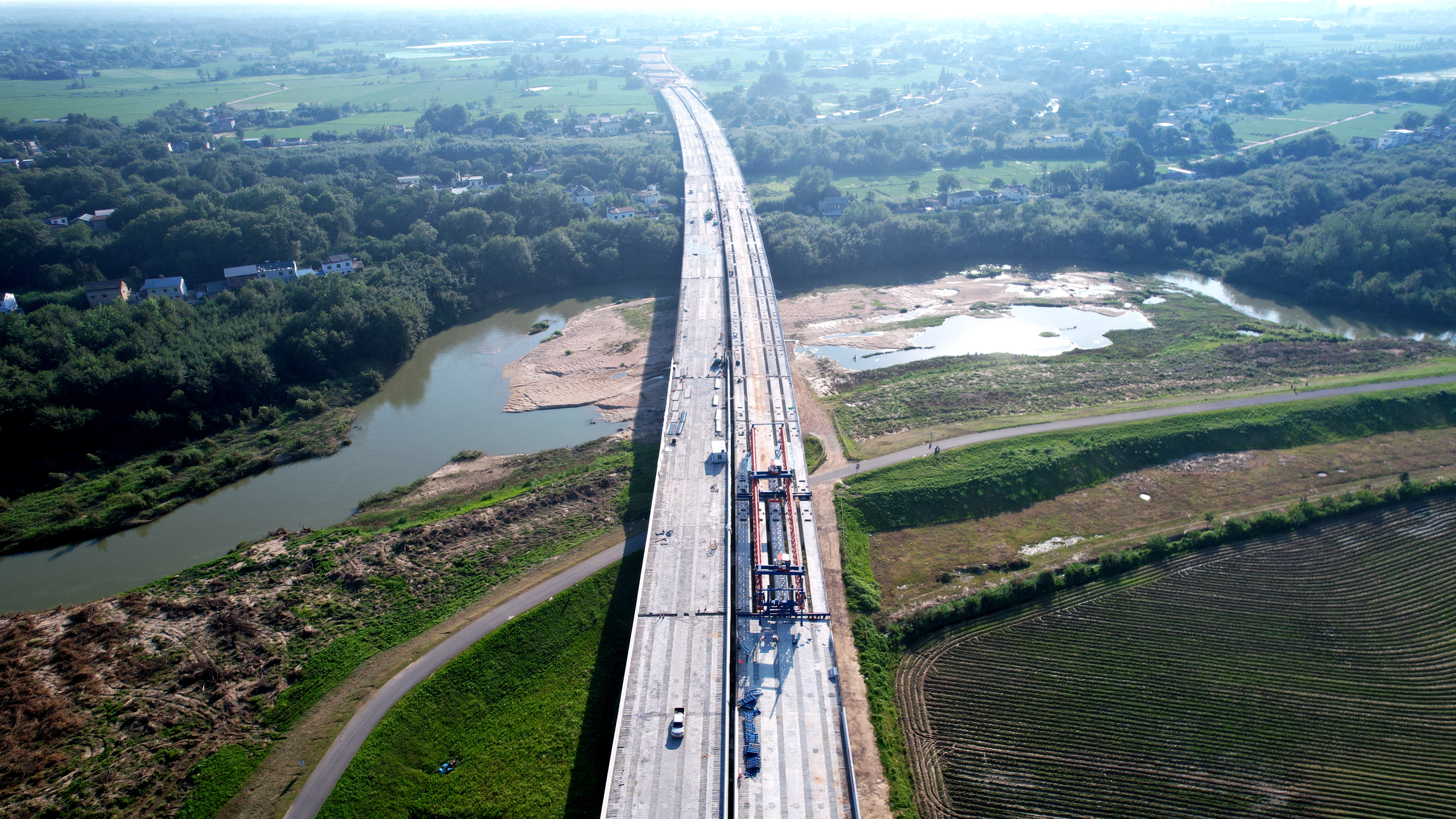 皖水河特大橋全長(zhǎng)3.59公里。橋梁需橫跨皖水河、梅河、珠流河三條河流,不僅要應(yīng)對(duì)復(fù)雜的水文地質(zhì)條件,還要克服季節(jié)性洪水等不利因素,項(xiàng)目團(tuán)隊(duì)創(chuàng)新采用提梁站提梁、架橋機(jī)與汽車(chē)吊協(xié)同作業(yè)的施工方式,大幅縮短了皖水河特大橋的梁板架設(shè)工期,為項(xiàng)目全線(xiàn)通車(chē)按下“加速鍵”。