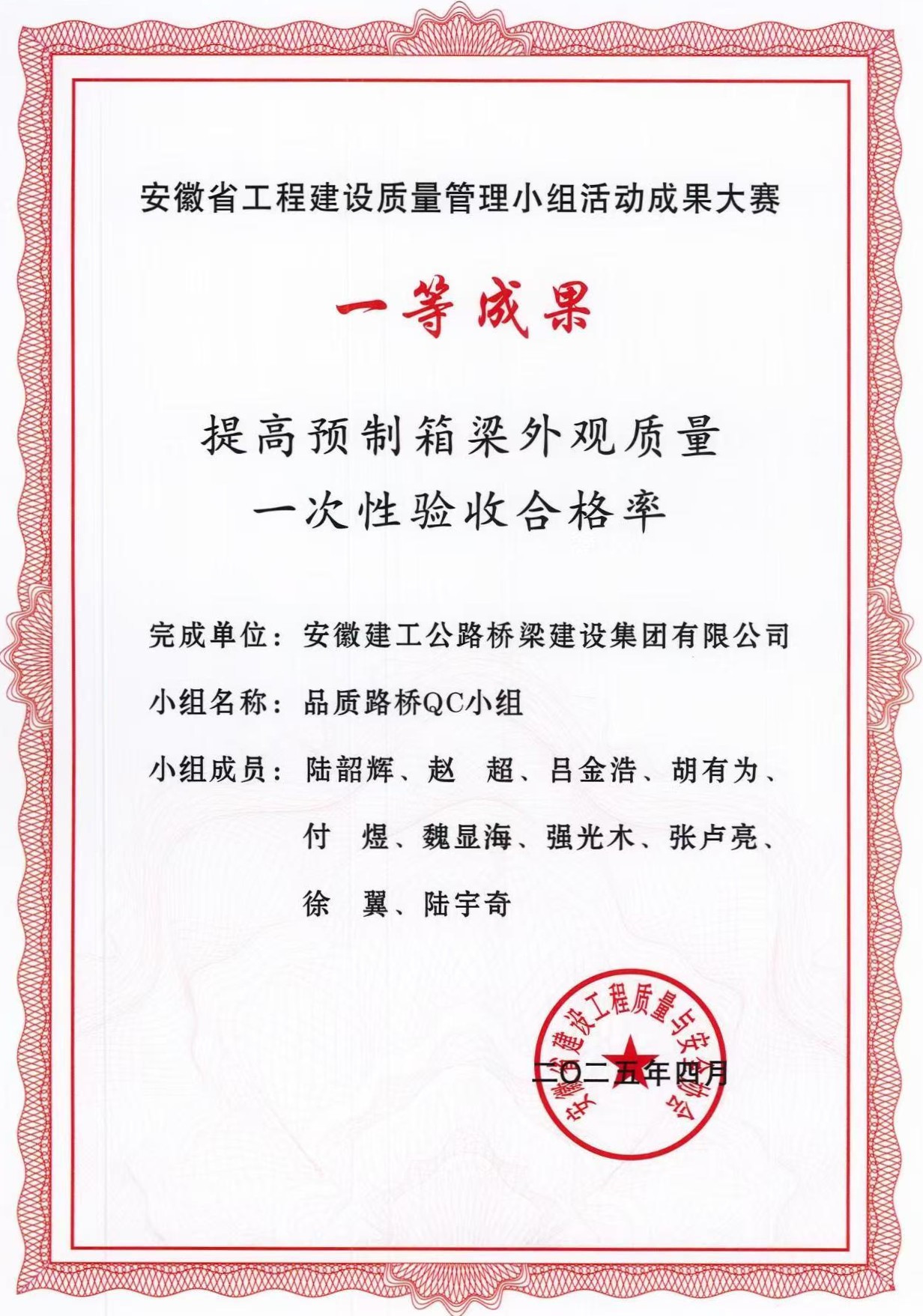 黨支部牽頭組建“品質(zhì)路橋”QC小組,聚焦預(yù)制箱梁外觀質(zhì)量痛點,對材料管理實行原材料進(jìn)場雙檢,針對性開展關(guān)鍵材料性能試驗;預(yù)制工藝嚴(yán)控模板拼裝精度,優(yōu)化混凝土振搗方式。改進(jìn)后,預(yù)制箱梁外觀合格率從89.67%提升至95.44%,每片修飾時間縮短2小時。成果《提高預(yù)制箱梁外觀質(zhì)量一次驗收合格率》獲安徽省QC成果一等獎,以“紅色匠心”護(hù)航工程品質(zhì)。