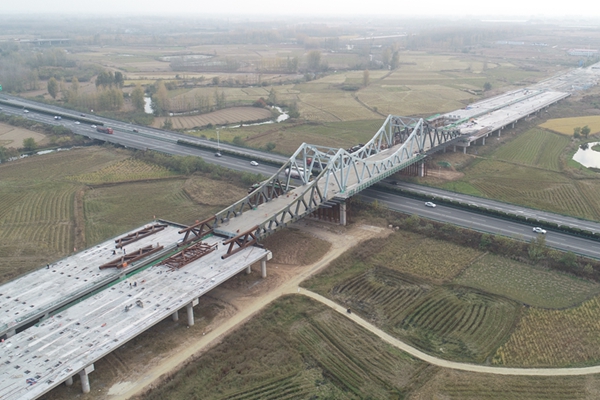 滁州大道項目鋼桁梁半幅頂推施工完成