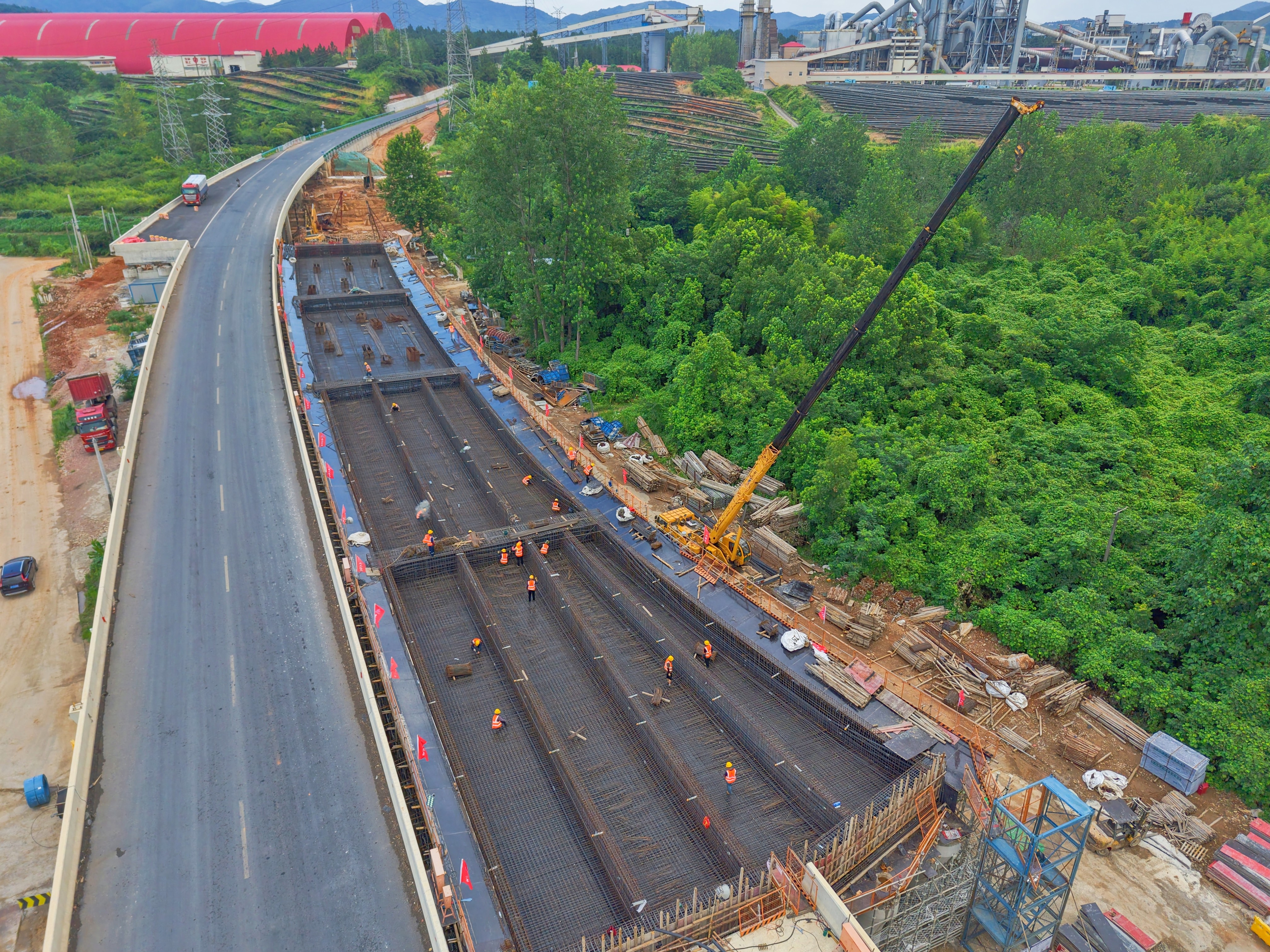 面對(duì)“邊施工、邊通車(chē)”的特殊施工環(huán)境,項(xiàng)目團(tuán)隊(duì)堅(jiān)持“既要保進(jìn)度,更要保暢通”的原則,采取半幅交替施工模式,將施工區(qū)域劃分為若干個(gè)作業(yè)斷面,同步推進(jìn)橋梁現(xiàn)澆、瀝青面層攤鋪等關(guān)鍵工序。王超介紹,目前全線路基工程已完成95%,全線預(yù)制梁板橋施工也已全部完成。作為控制性工程,水東四號(hào)橋施工進(jìn)展順利,目前已完成約85%的工程量,正在進(jìn)行右幅第五聯(lián)鋼筋綁扎及第六聯(lián)樁基施工作業(yè)。