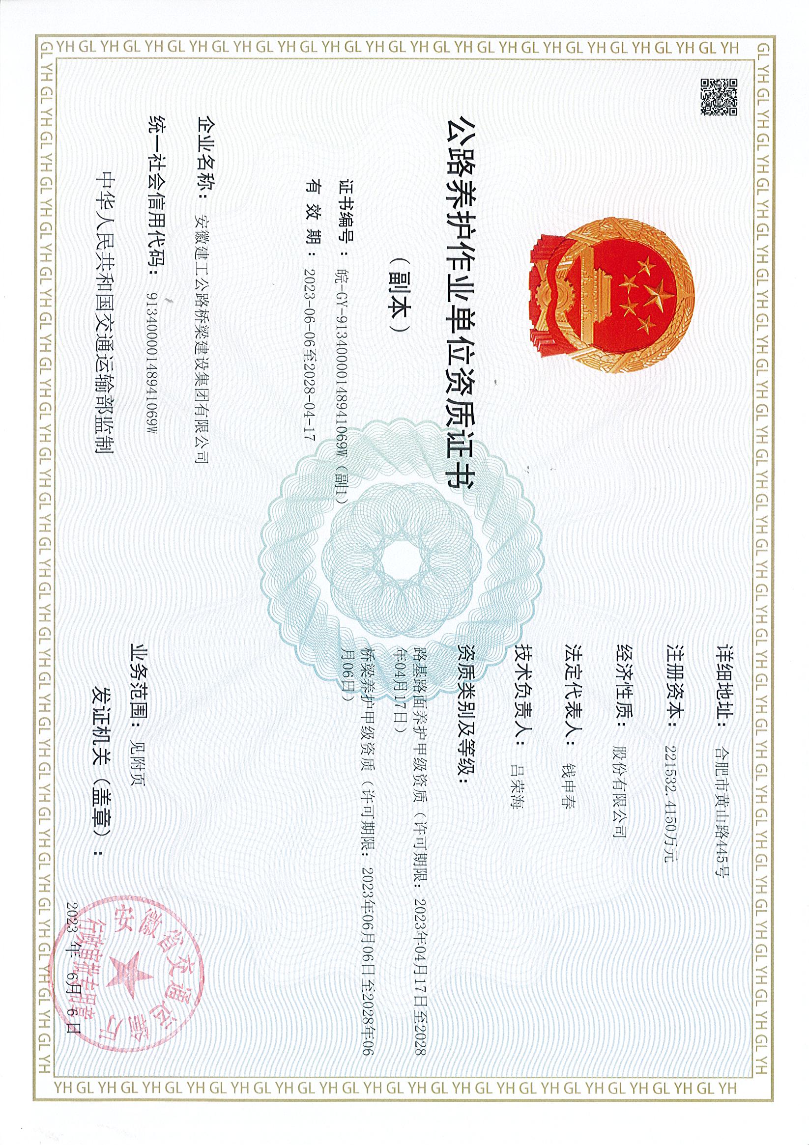 公路工程施工總承包特級、公路路面工程專業(yè)承包壹級、公路路基工程專業(yè)承包壹級、公路交通工程(公路安全設施)專業(yè)承包壹級