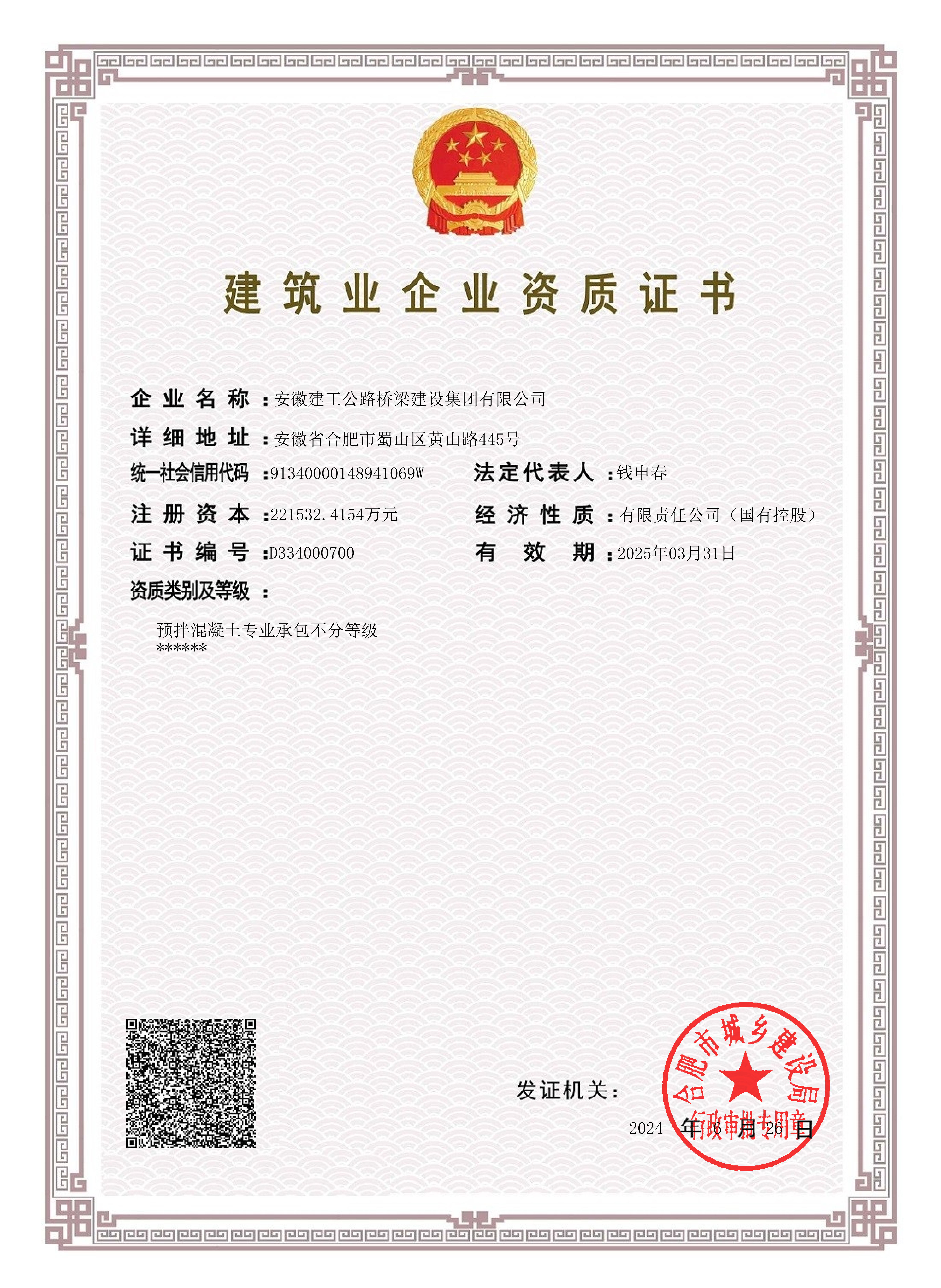 隧道工程專業(yè)承包壹級、城市及道路照明工程專業(yè)承包壹級、地基基礎工程專業(yè)承包壹級、環(huán)保工程專業(yè)承包壹級、橋梁工程專業(yè)承包壹級、市政公用工程施工總承包壹級、建筑工程施工總承包壹級、鋼結(jié)構(gòu)工程專業(yè)承包壹級、建筑裝修裝飾工程專業(yè)承包壹級